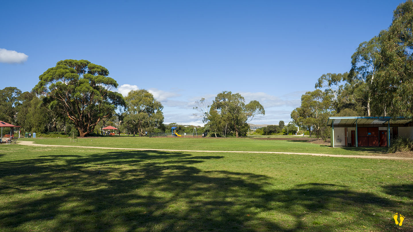 The park has interesting birdlife, including parrots, plovers, and miner birds. Dogs allowed on-leash but not within 10m of playground areas.