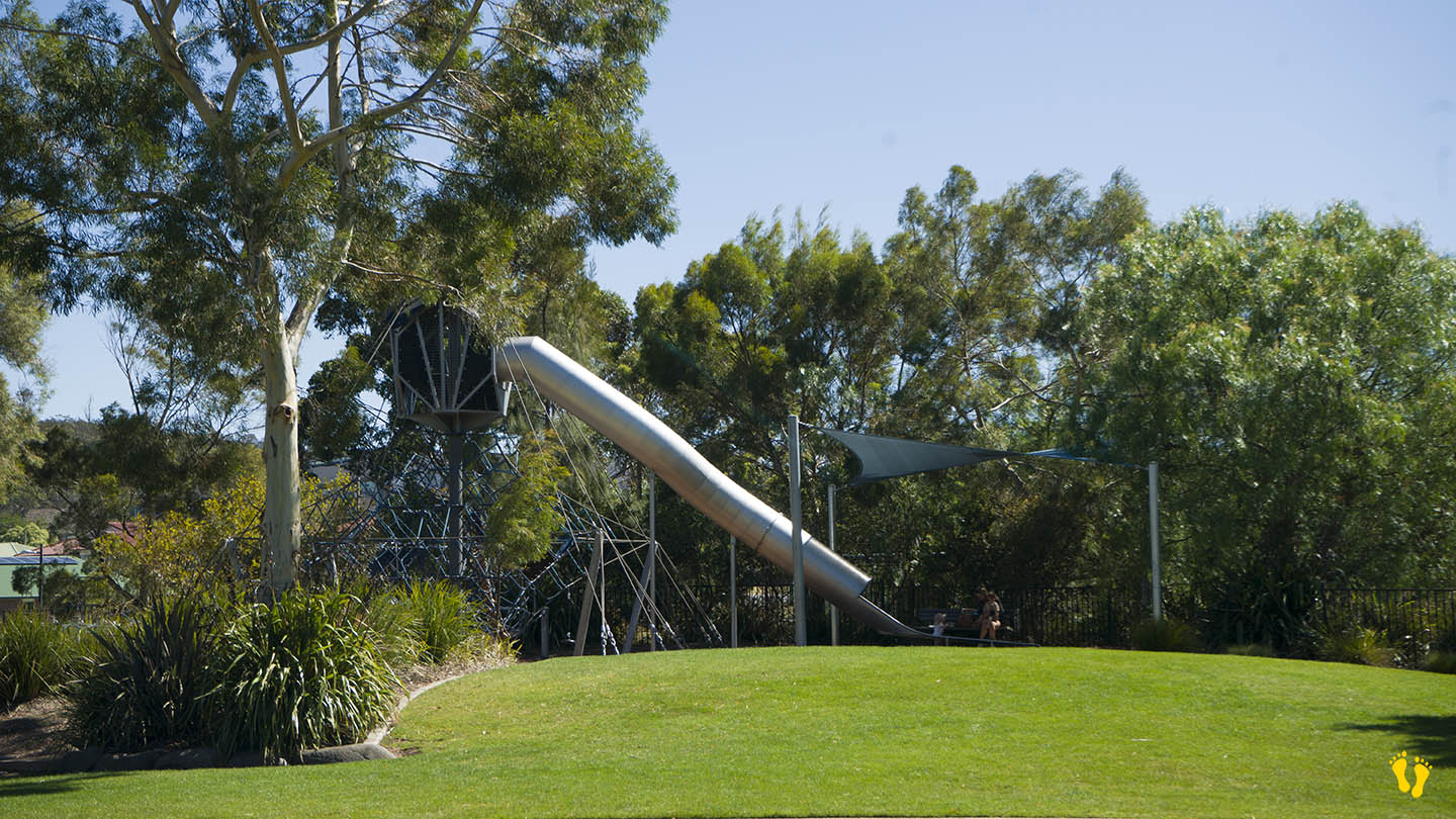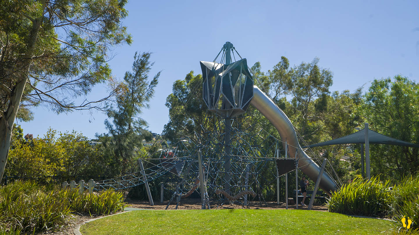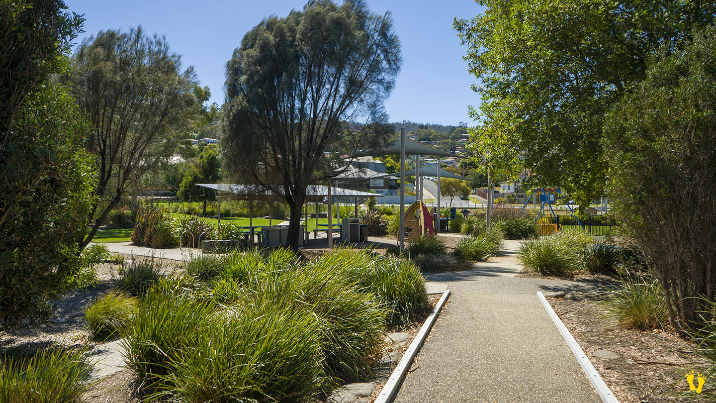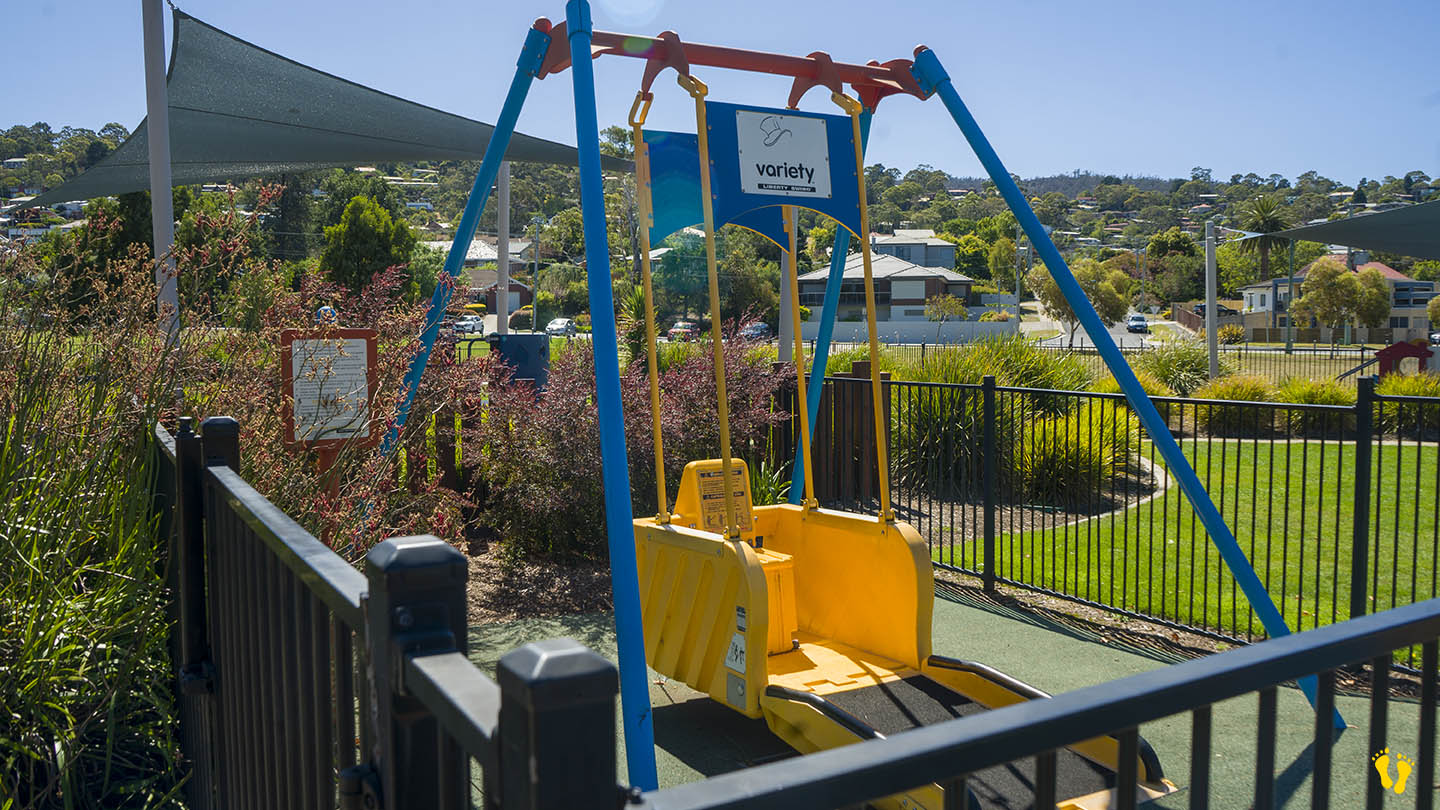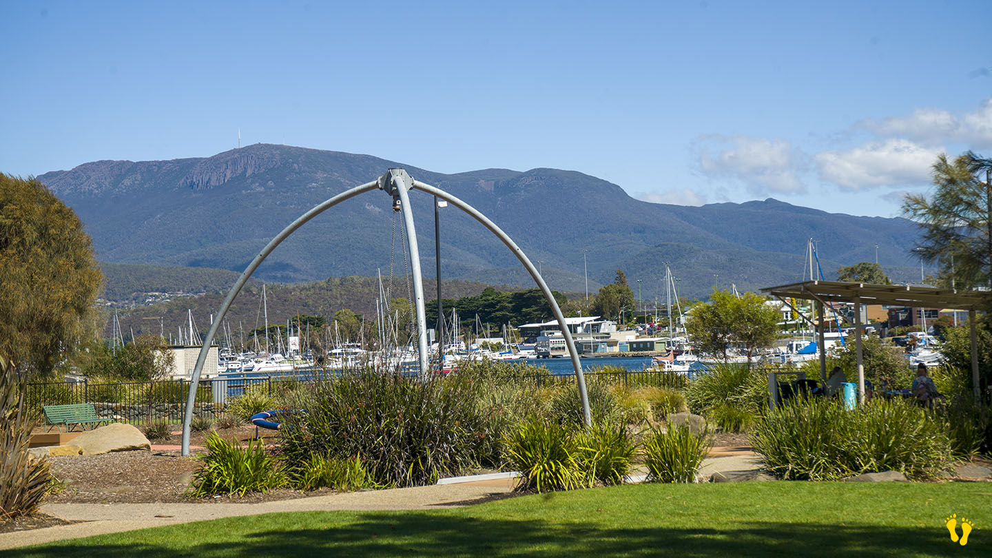 The playground is part of a large park with beautiful landscaping and views of Kunanyi over Lindisfarne Bay.