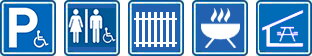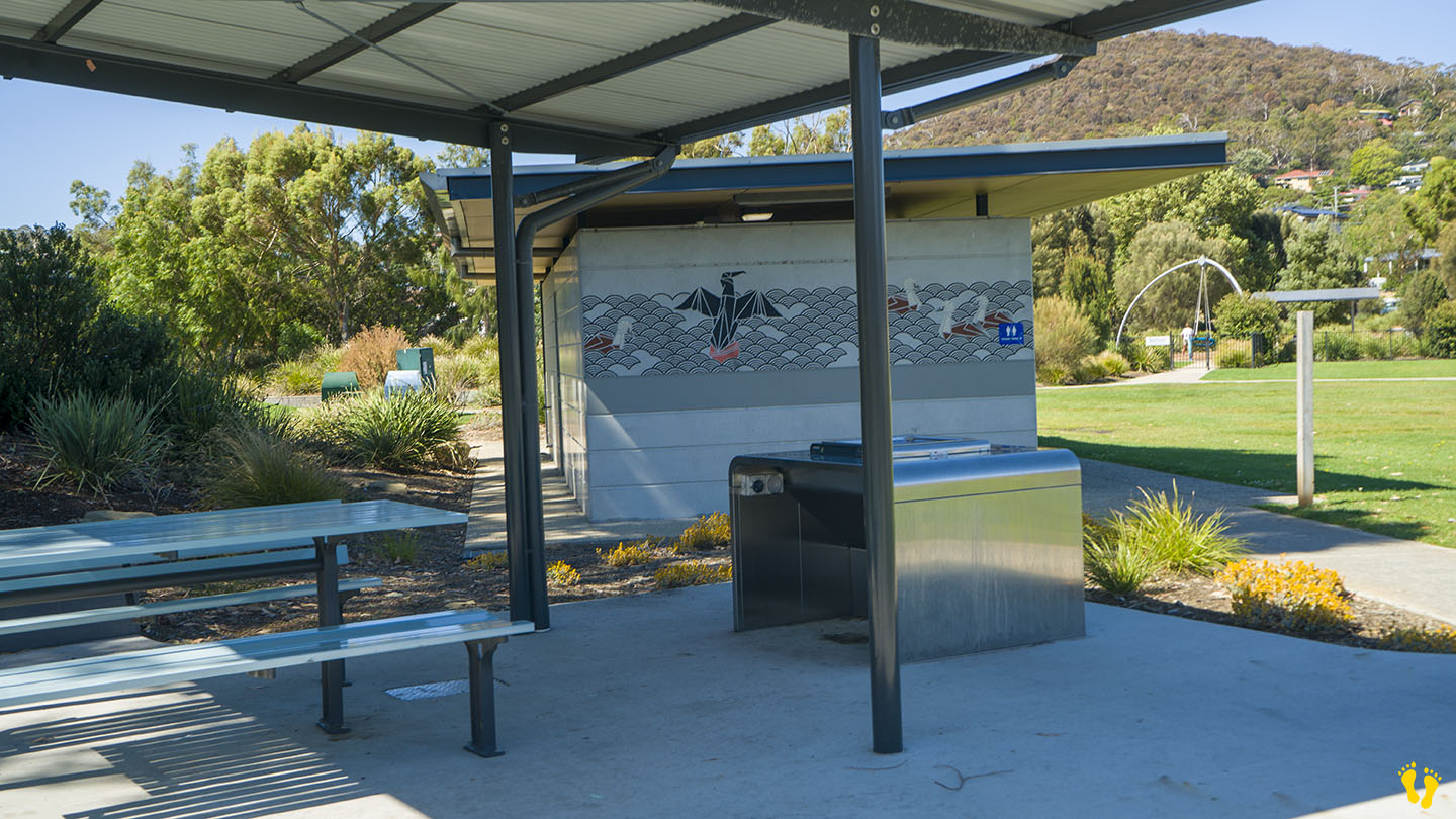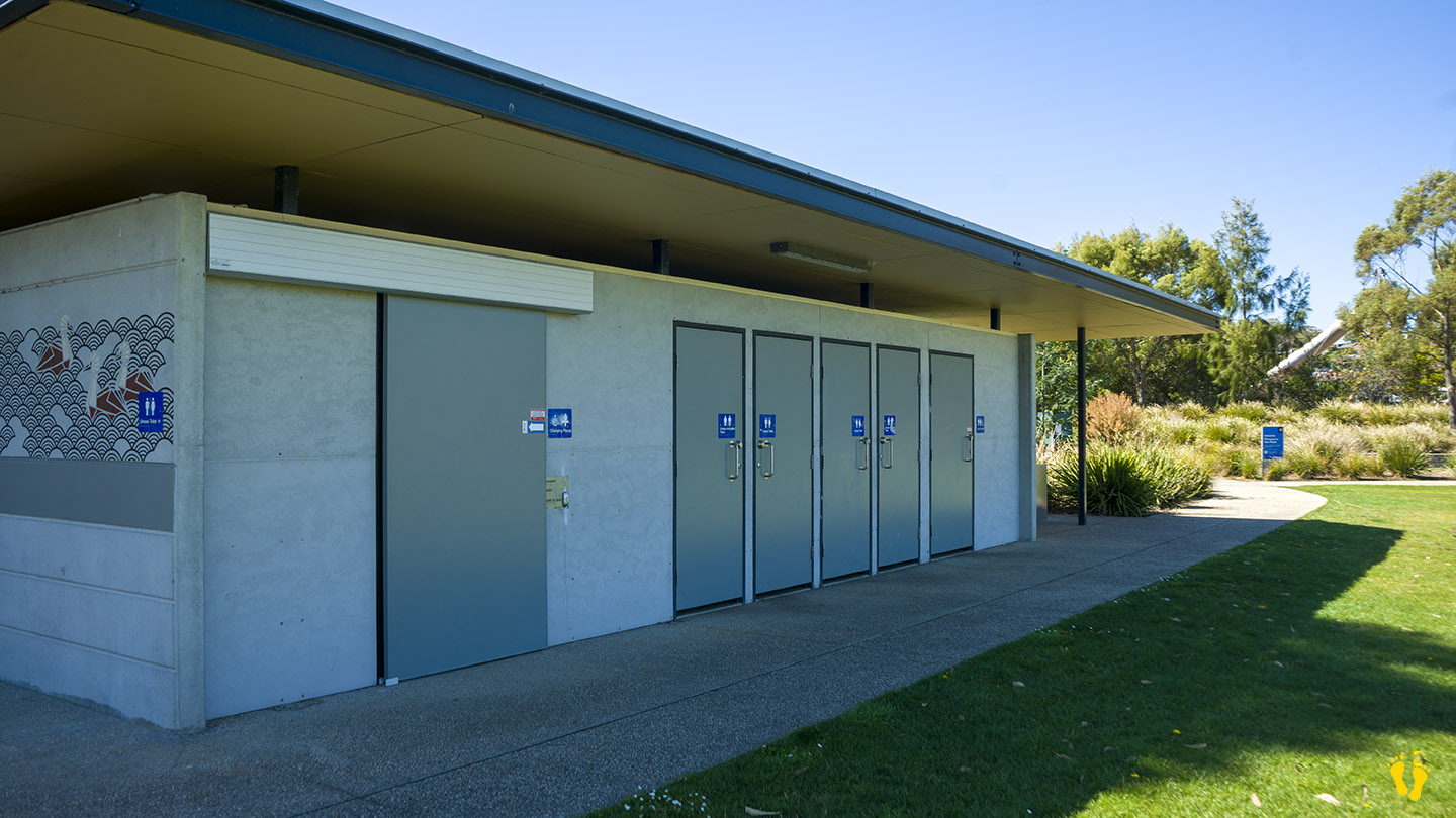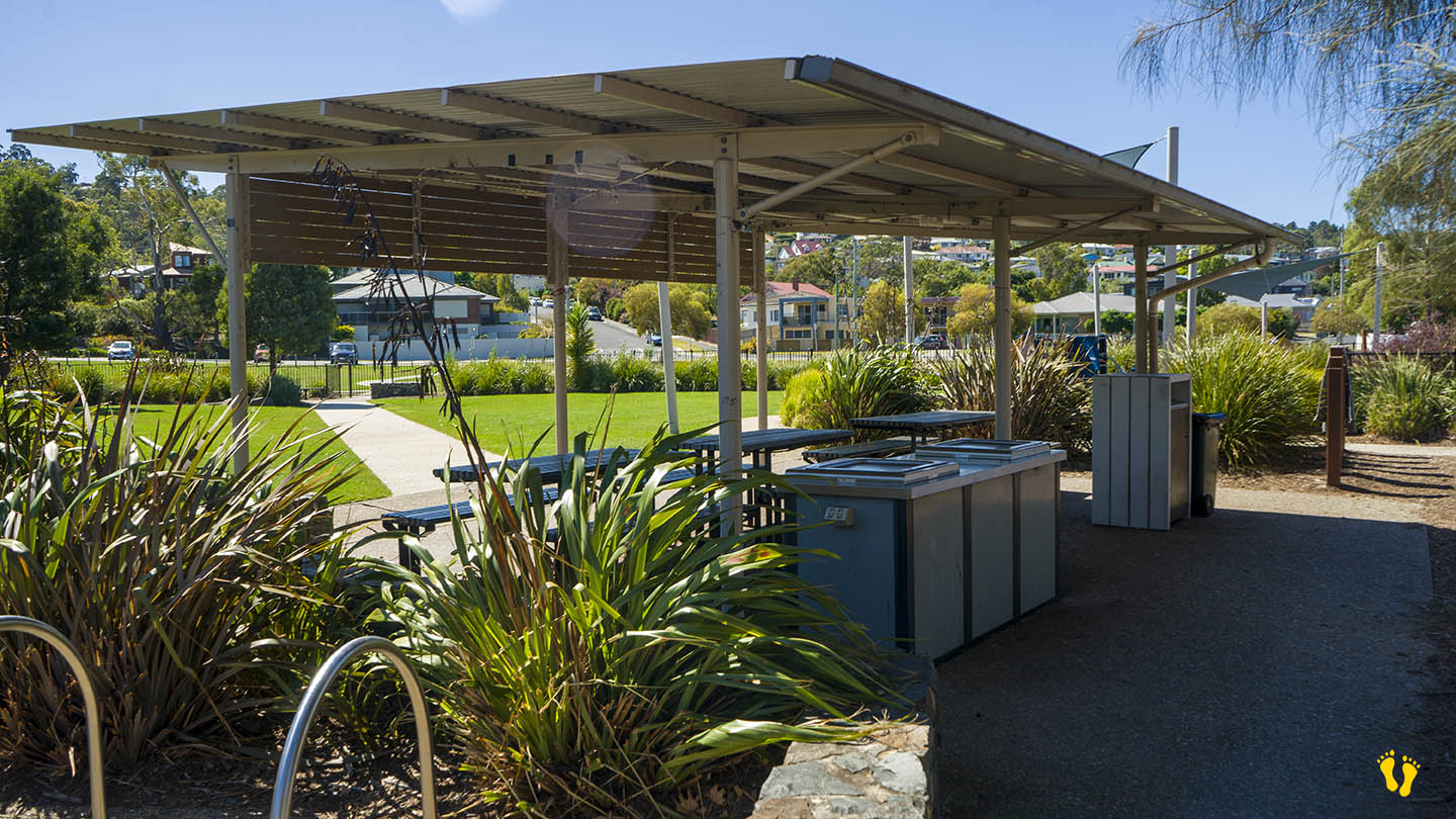 Several BBQs (inside and outside fenced area) with covered tables & seating. Toilets are up to 100m from the playground area.